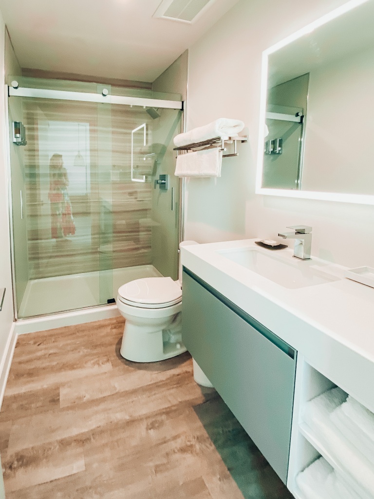 On to the rooms. They are so cute! Modern Beach Chic is what I called them all trip long. My husband would have been ready to buy a condo here if that was a possibility. They are condo-style rooms with kitchens, dining room, extra bathrooms and a deck. SO DANG CHIC. We loved the 2 bedroom, 3 bathroom condo we stayed in but looking at the photos, each one is just as good. We enjoyed having a coffee maker, bowls and pans, a nice-sized fridge and all the Samsung tvs! The bathrooms are nice and modern and will stay that way for years to come. Walk in showers, with nice toiletries and modern touches. Beds were super comfy and there were plenty of soft pillows and blankets. We were not in the room much but when we were, it was extremely relaxing. Our deck looked off to the beach and the channel. We could see a bit of the ocean and the wind surfers the first day. We loved that!