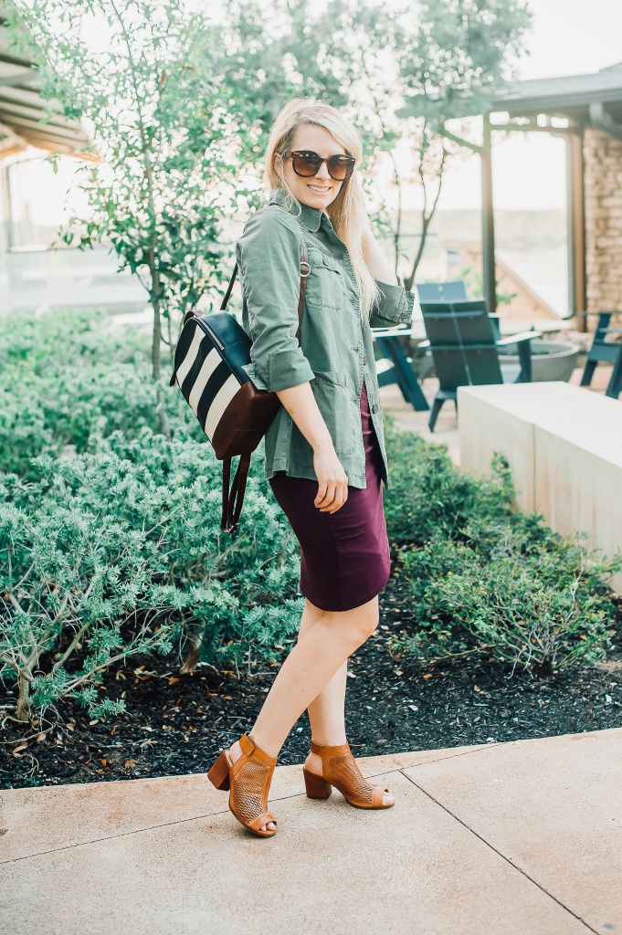 Outfit details: Leather Backpack: Radley London // Best Dress Ever: Nordstrom // Utility Jacket: Nordstrom // Shoes: Vince Camuto